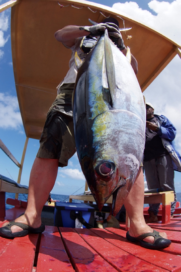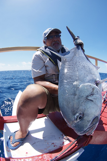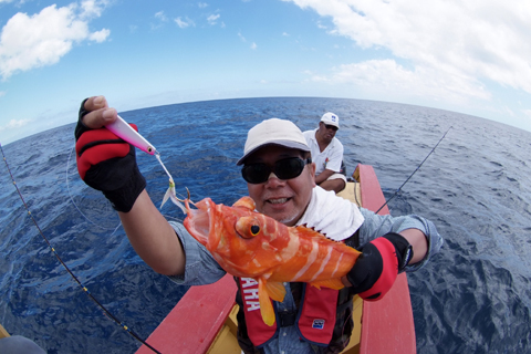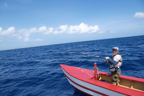 この島は通年風が吹いていて周辺はいつも風波が立っています。風向きは一方向ではなく日々変わり、またうねりが入ることもあります。ターゲットはGT、キハダマグロ、ハタ類をはじめとする根魚が多く大型のものも少なくありません。またカジキマグロもしばしば水面近くに姿を現します。