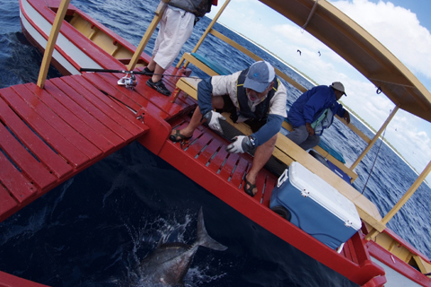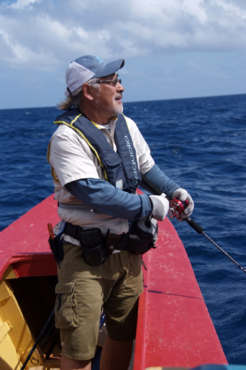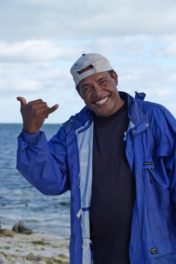 クリスマス島にはロッジ「イカリハウス」に専属のベテランガイドがいる他、島内に数名のフィッシングガイドがいます。いずれも漁師として長年のキャリアをもちラグーンのボーンフィッシュのフライフィッシングからGTやカジキマグロ狙いのキャスティングに加え、100m位までのジギングのガイドにかんしては地形や潮をほぼ正確に読んでいます。しかし船には魚探もナビも装備されていないので100m以深のジギングにかんしてはやや手探りの状態です。